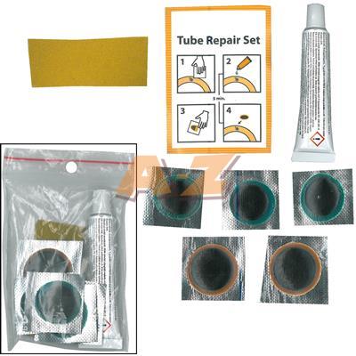 súprava obsahuje: lepidlo 5g, 5 opravných záplat, brúsny papier, obrázkový návod a informáciu o vulkanizačnom roztoku